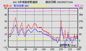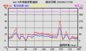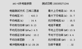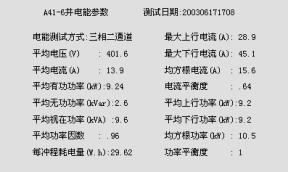 A41-6井最后采用的是方法六的结果,在2003年6月17日下午进行了平衡调整,下图是调整后重测的电力参数曲线及电能数据。从中可以看出,经过调整,上下冲程的平均功率均为9.2kW,达到了理想的平衡。 |